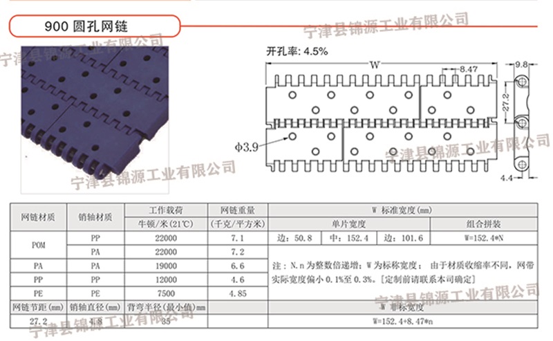塑料網(wǎng)帶由鏈輪驅(qū)動,網(wǎng)帶節(jié)距主要有12.7mm、15.2mm、19.05mm、25.4mm、27.2mm、38.1mm、50.8mm、57.15mm,開孔率2%-48%